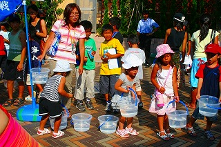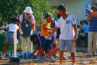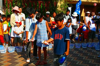 ![]() さあ、打ち水開始。商店街ではこのあとお祭り。 涼しくお祭りを迎えられるかな。 |
