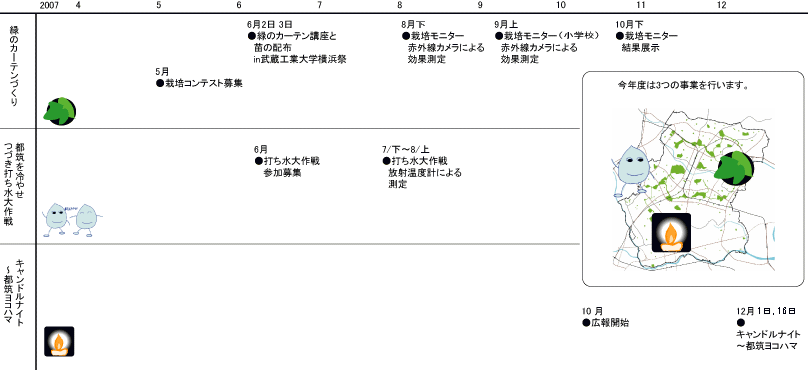 ツル性の植物を家庭のべランダや学校等で育て、窓際に「緑のカーテン」を作ることで夏の暑さを和らげ、自然の力で涼しく過ごすライフスタイルの普及啓発を推進します。幅広い区民の参加を促すため、栽培モニターを募集し6月2日3日の武蔵工業大学の学園祭のグランウンドテントで苗を配布し、栽培講座を行います。また小学校単位での取り組みも呼びかけます。実際に赤外線カメラで測定するなどして、効果を検証し、10月下旬に区役所ホールでの展示等での成果発表と次年度への多くの区民への取組を呼びかけます。