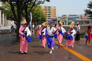 区役所のほうへ向かって打ち水を行ないました。