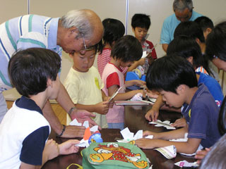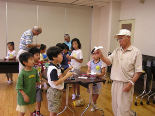 | 真剣な表情で作ります。うまく飛ぶかなあ。。広告の紙やカレンダーの裏紙を利用した工作。 | |