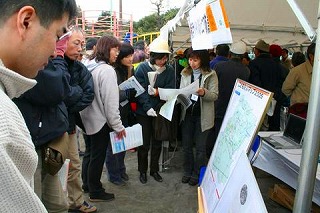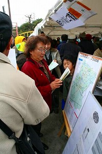 テントでは当日のようすをDVDで投影したり、子どもたちの作った「こども防災マップ」やパンフレットをパネルにいれて展示したりしました。