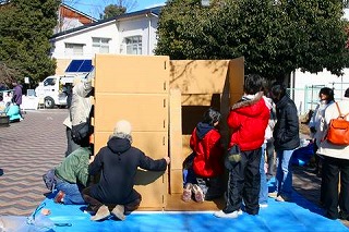 こちらで用意した設計図に基づいて作る家はKAGUパネルというダンボールを使って作りました。