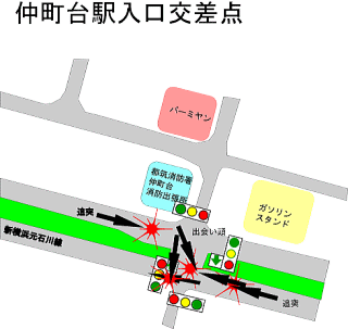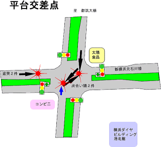 この交差点を頂点として北東(区総合庁舎前)から上り坂、南西(中山方面)に向かって下り坂。新横 浜元石川線は、片道三車線もある大きな交差点であるため、歩行者もぼやぼやしていられない。
