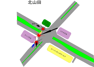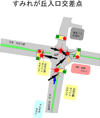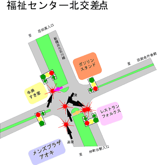 南北の信号には、右折矢印がないわりに、右折車が多い。歩行者、自転車の事故も多くある。