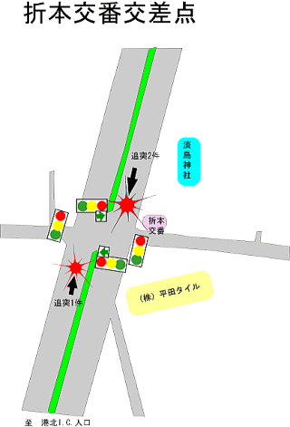 写真の交番前で追突2件とバイクとの接触事故1件。反対車線でも追突が1件あった。