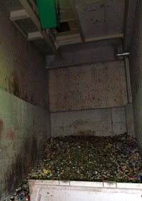 分け終わって最後に残ったものたち。電池や再生できない化粧品のビンなど、これらはゴミとして埋め立てられる。 全体の15%もあるそうだ。 上部に見える穴から、ガチャンガチャンと音を立てながら落ちてくる。 |