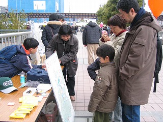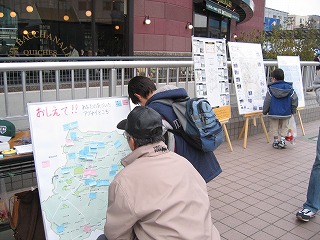 センター北まつりが3月19日20日と行われました。 私たちは交通局のブースのお手伝いをしました。 市営地下鉄センター北駅すぐ、 モザイクモール阪急の前です。 その横にパネル展示をしながら、 歩行者からみた交通のあぶない場所、 車を運転する側からみた交通のあぶない場所を通りがかった人にポストイットに書いてもらいました。 みなさん、じっくり地図をみて、いろんなことを書き込みしてくれました。 なかには「この辺はガラの悪い人が多い」という書き込みがあったりして(苦笑)。 |