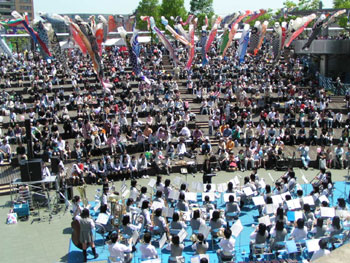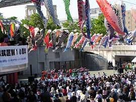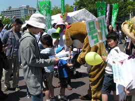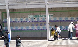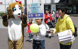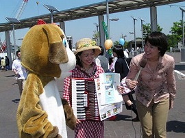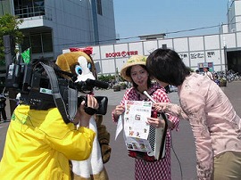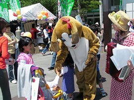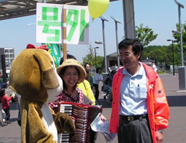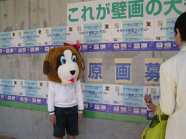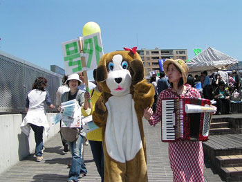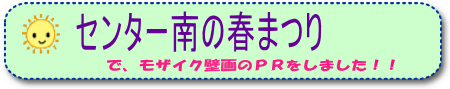 青空広がる、気持ちのいい天気の中、センター南まつりが行われました。 私達はすきっぷ広場で行う「モザイク壁画コンテスト」のPRをしました。 タウンニュースが、モザイク壁画の特集号を増刷するという形で、号外を出してくれました。 ぬいぐるみのワンちゃんとアコーディオンを持って、号外とチラシをくばりました。特にワンちゃんは大人気。 つづきケーブルと東急ケーブルがこのようすを取材してくれました。