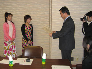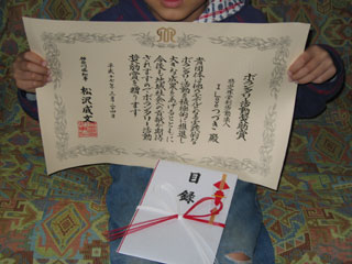 ![]() 松沢知事から賞状と目録を受け取っているところ。 |