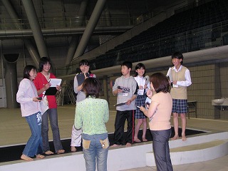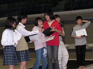 4月14日は、国際プールの休館日。 実際の現場をみながら、顔あわせをしました。 区民まつりなどの司会でもおなじみの、プロのアナウンサーである、林さゆりさんに来ていただき、司会の基本のキを教えていただきました。 みんな緊張気味。できるかな〜という不安な気持ちが声にでてしまい、林先生に「そんなんじゃ聞こえないよ〜伝わらないよ〜もっと大きい声でね。」といわれていましたよ。